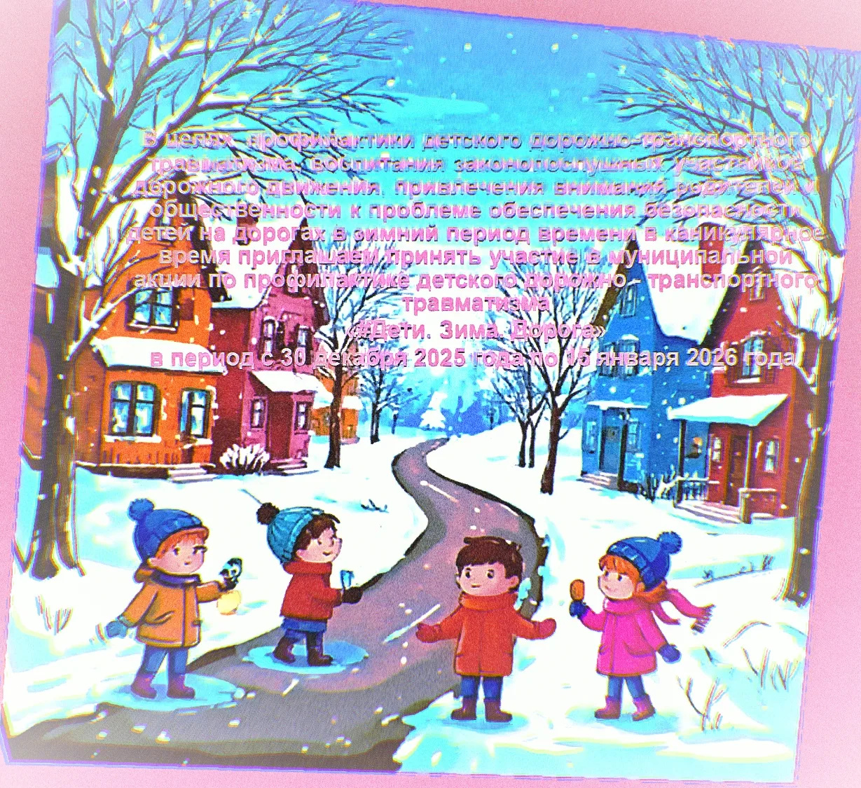 В целях профилактики детского дорожно-транспортного травматизма, воспитания законопослушных участников дорожного движения, привлечения внимания родителей и общественности к проблеме обеспечения безопасности детей на дорогах в зимний период времени в каникулярное время приглашаем принять участие в муниципальной акции по профилактике детского дорожно - транспортного травматизма «#Дети. Зима. Дорога» в период с 30 декабря 2025 года по 15 января 2026 года.